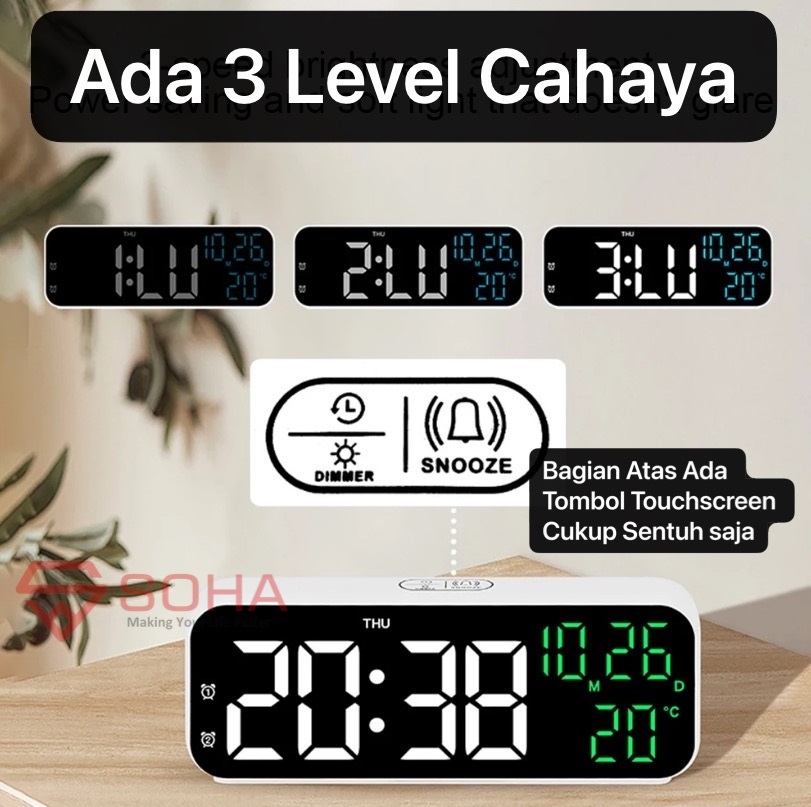 - Terdapat 3 Tombol Touchscreen Yaitu Cukup Disentuh Untuk Setting Hitung Mundur & Level Terang dan Snooze Alarm