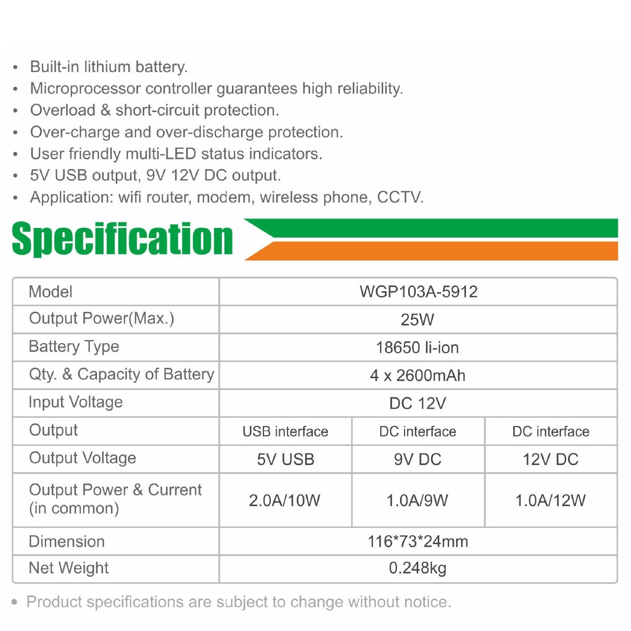 + Output : 3 Port Yaitu : USB 5V 2Ampere dan 9V 1Ampere dan 12V 1Ampere
