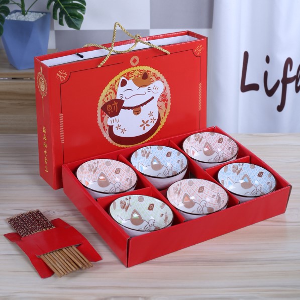 ART-057 6 Bowl Lucky Cat Hampers Imlek Kado Natal Souvenir Gift Hadiah Ceramic Tableware Set Mangkok Sumpit Keramik Tahun Baru Chineses New Year
