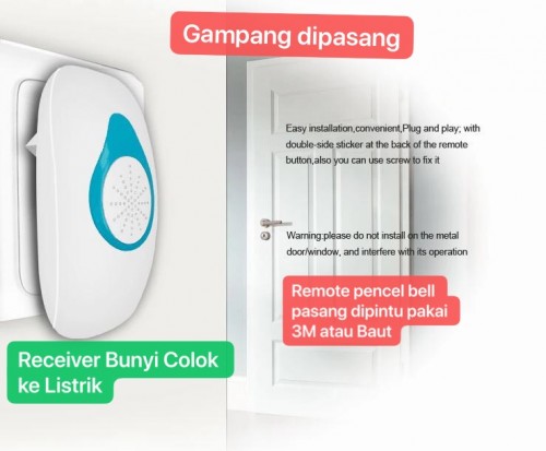 Bell Pintu untuk Rumah atau Ruko atau Cocok Buat Kantoran, Design yang Simple serta pemasangan yang sangat mudah, didukung dengan Wireless yang kuat tidak perlu tarik kabel lagi. Kualitas Terjamin Bagus Proses Quality Control yang ketat.