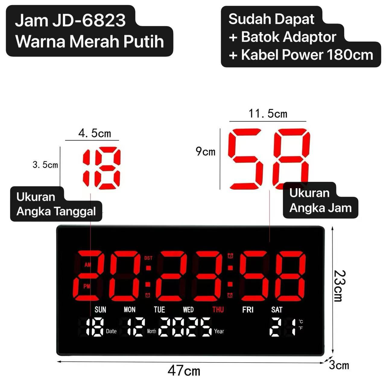 JD- 6823 LED Merah Putih Jam Dinding Digital Layar Besar 47 x 23 cm LED CLOCK WALL Dinding / Meja Smart Watch Kalender & Alarm