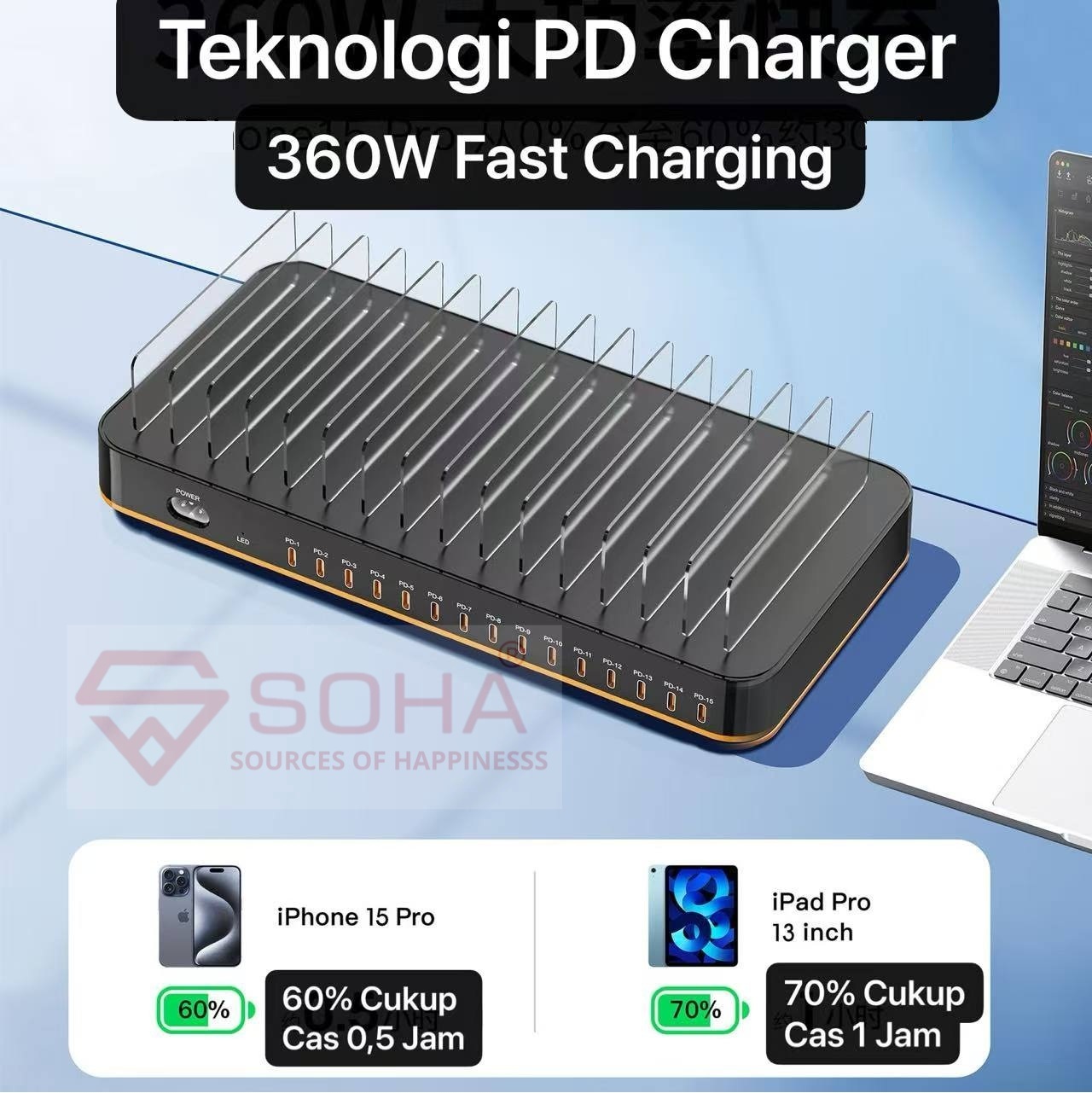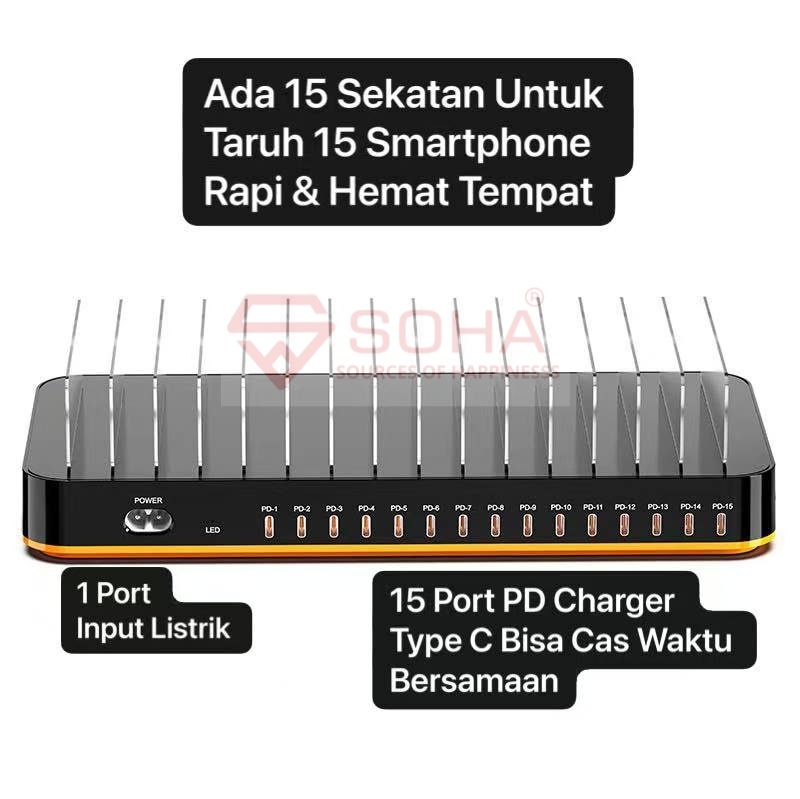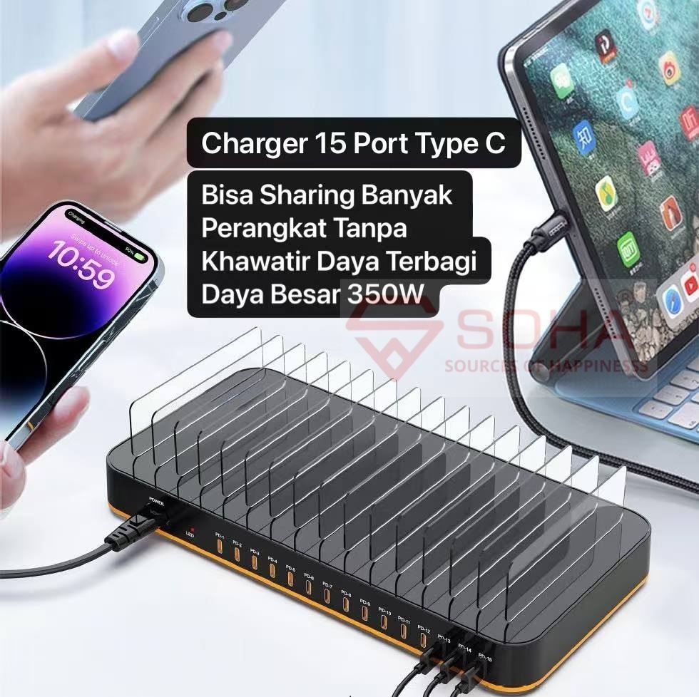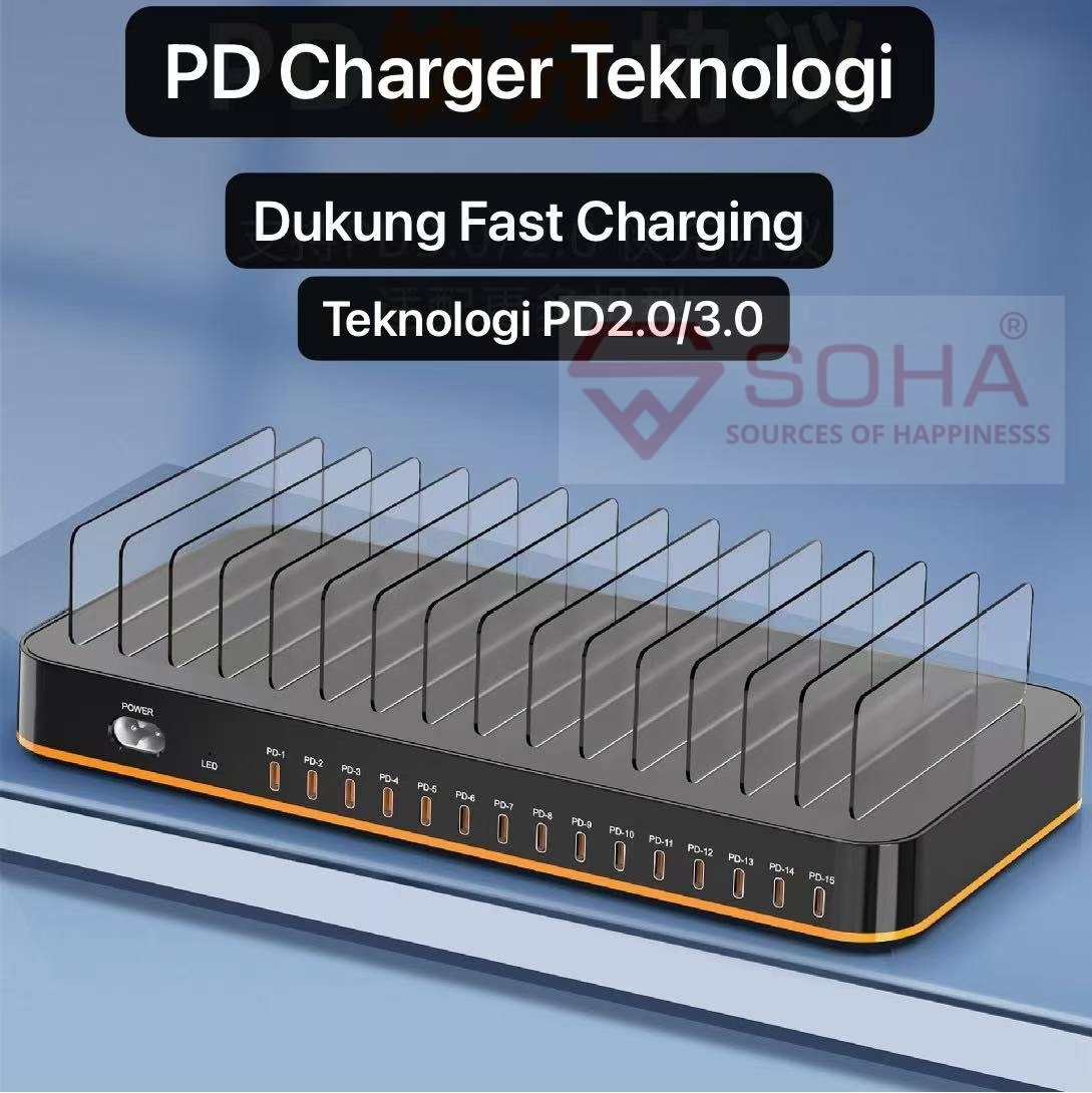+ Charger Station Dengan 15 Port Type PD Charger Total Daya 360W